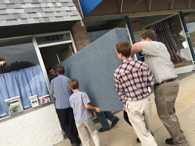 Our church hosted Tent Revival Meetings in September. For those of you that don't know, our church is a small store front building on Main Street in Griswold. There's a vacant lot across the street from us with just enough room to set up a smaller "circus" tent. The man who owns the lot allows us get electricity from his welding shop in the alley behind the vacant lot. The boys rig the sound system up so that there's a speaker projecting the sound into the street.
